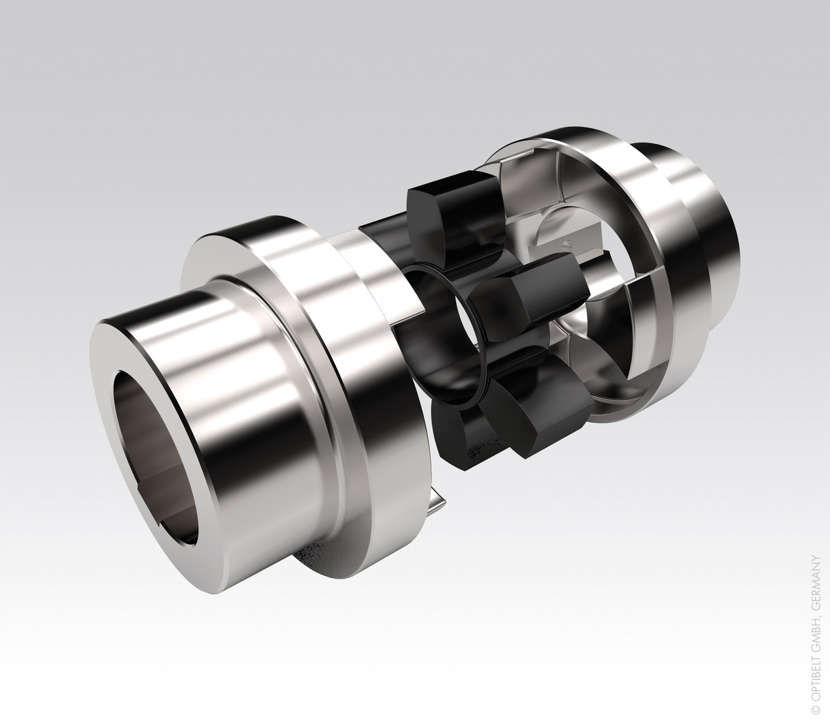 The elasticity of the coupling effectively dampens shocks, torsional vibrations and noise. The coupling spider is designed to compensate for radial and axial movements between the two coupling halves. Due to the fixed position of the coupling spider, the deformability in the axial direction is free, so that no damaging axial forces can act on the machine bearings even with changing torque.